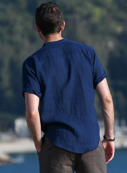 Navy Blauwe Korte Mouwen Overhemd voor Mannen met Patches en Halve Knopen